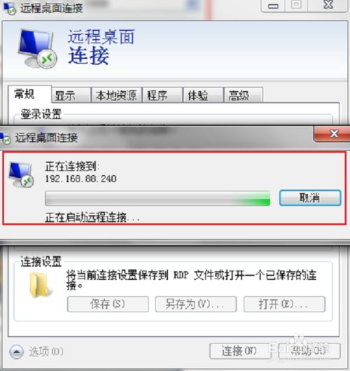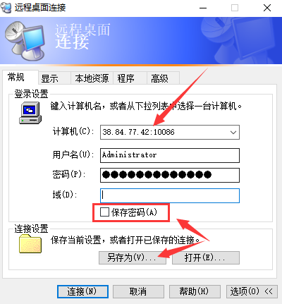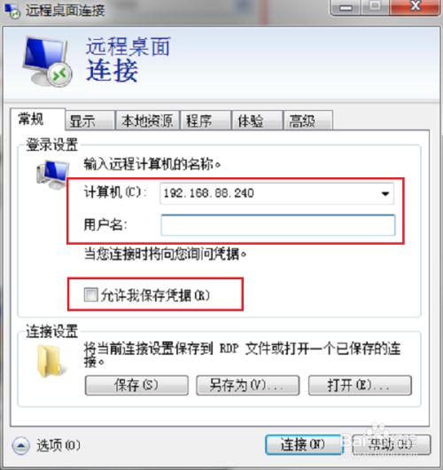 第三步我们也可以在远程桌面连接界面上,点击选项,输入远程连接的服务器的地址,名称,勾选“允许我保存凭据”,点击连接,如下图所示: