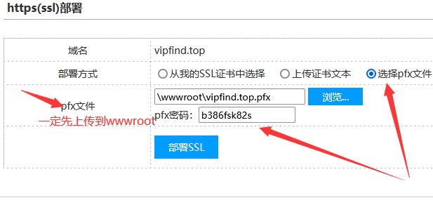 如还没有SSL证书,请咨询我司客服购买申请SSL证书,其它公司申请的证书也可部署我司空间; 1、SSL介绍及价格: http://w.515ip.com/services/ssl/ 2、特价:月付20,季付50,年付150;联系客服购买 3、为什么要SSL证书 https://www.byun.com/article/show.asp?id=24 特别提醒:默认我司空间是Windows环境,请下载部署IIS版本的证书;并一定按如下方法操作部署: 部署流程如下:(经我司申请的办理的SSL证书,我司技术帮搞定一切部署操作) 第一步:从SSL申请平台下载IIS版本的证书文件(pfx文件),上传到您在我司的站点根目录: wwwroot里; 第二步:进入要部署的空间的管理面板,找到SSL部署地方进行操作,如图:可在域名绑定处,也可在下部的:SSL部署