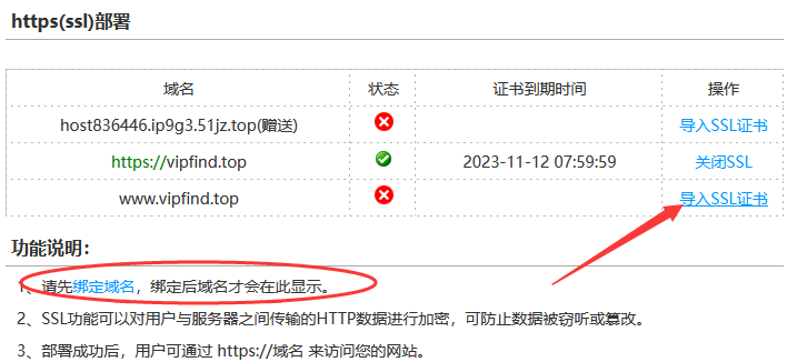 提醒:一般站点只能部署一个域名的SSL证书文件,即当此站点要部署SSL证书,不要绑定多个不同域名;不然其它域名无法访问; 有关强制跳转将http跳转到https的方法: 请在本机创建一个web.config 的文件 ,将下面代码复制到文件 中,再将此文件web.config上传到wwwroot根目录里: 代码如下: <configuration> <system.webServer> <rewrite> <rules> <rule name="http redirect to https" stopProcessing="true"> <match url="(.*)" /> <conditions> <add input="{HTTPS}" pattern="^OFF$" /> <add input="{HTTPS_HOST}" pattern="^(localhost)" negate="true" /> </conditions> <action type="Redirect" url="https://{HTTP_HOST}/{R:1}" /> </rule> </rules> </rewrite>