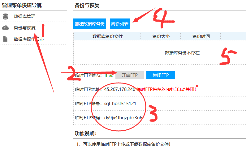 此方法说明:找到数据库面板,按上图1-4步,一看就明白; 点第1步后,一定要开启FTP(即创建数据库临时FTP,而不是用站点程序的FTP),然后上传mysql备份文件到此临时FTP; 再点上面的刷新列表(即可看到刚上传的备份文件 ),点5处的,还原数据库; 提醒:1、当程序运行一段时间,要备份下载数据库,也是在此处; 2、如上导入后可点:高级管理 看是否生成表?如生成则导入成功。 二、phpmyadmin 在线导入: 如图 [进入数据库高级管理],导入数据库后变生成表文件