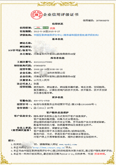 企业信用评级证书